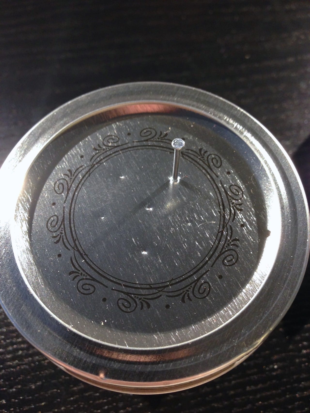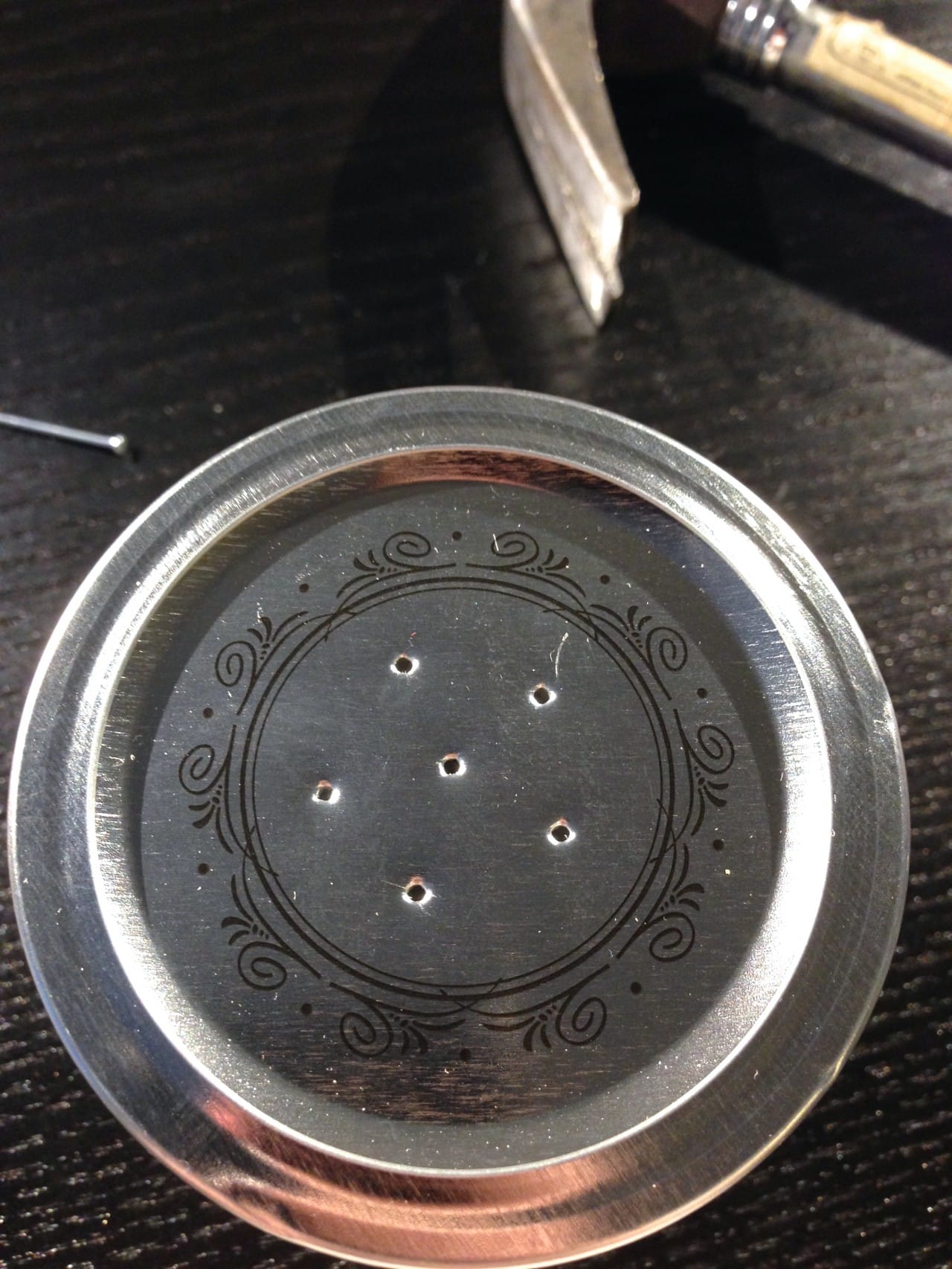 - With lid firmly on jar, gently make 6 dents (one in center with five in circle around it) using the nail and hammer.