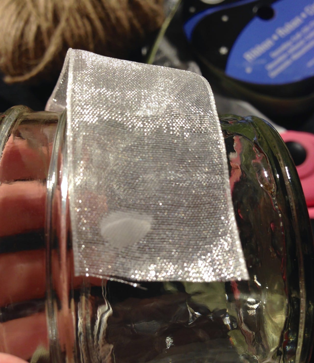 - Next, put a small dot of glue on your jar where the first ribbon will go.