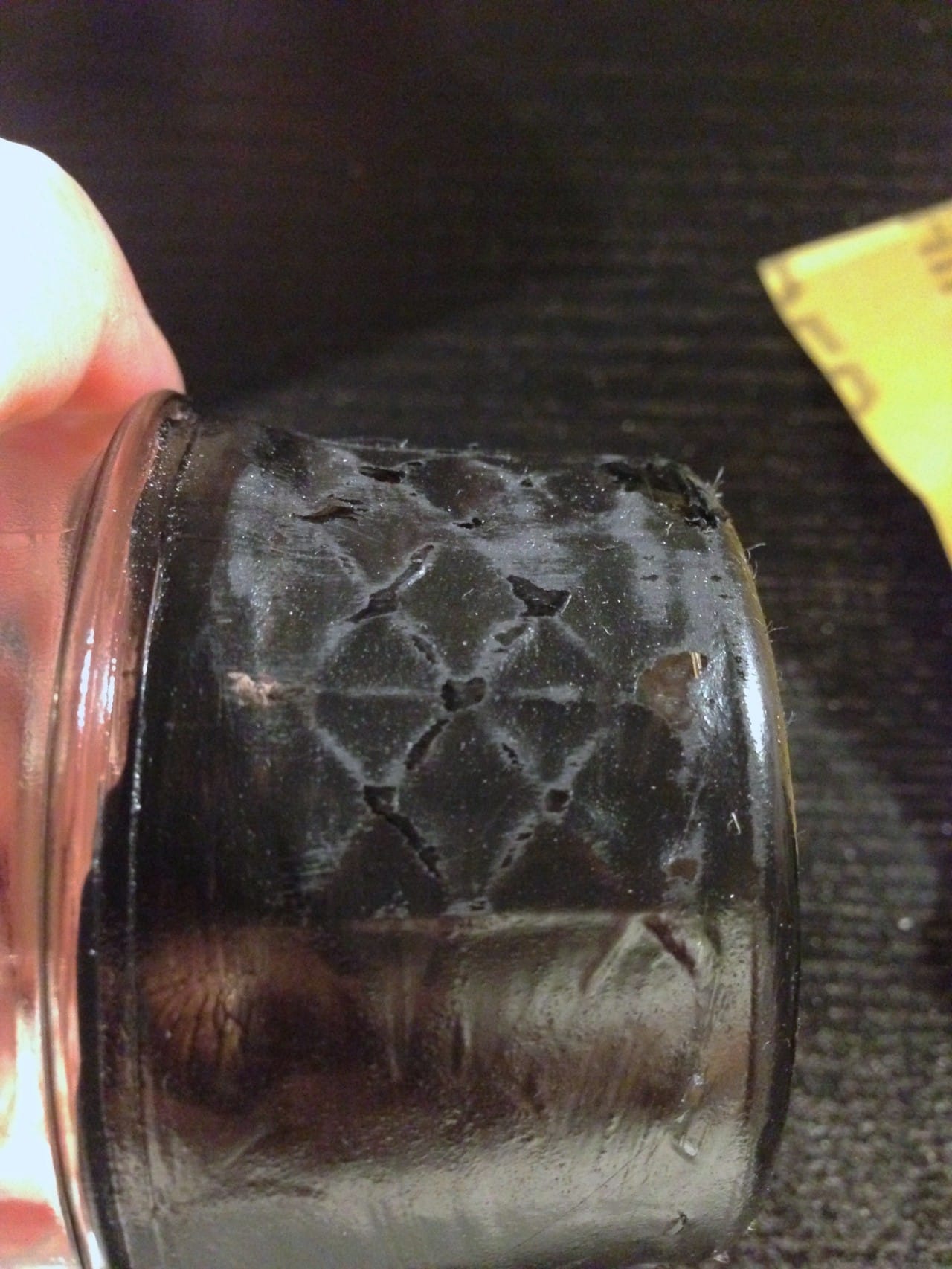 - When your jar is totally dry, use the sandpaper to go over the raised areas of glass. This will give it the distressed vintage look! If you are using a jar with raised text on it (such as Ball), then you can gently scrape away the paint from the word so it becomes visible. Because I used the quilted jars, I was able to distress many spots! Do this to your heart’s content- it is up to you how you want it to look.